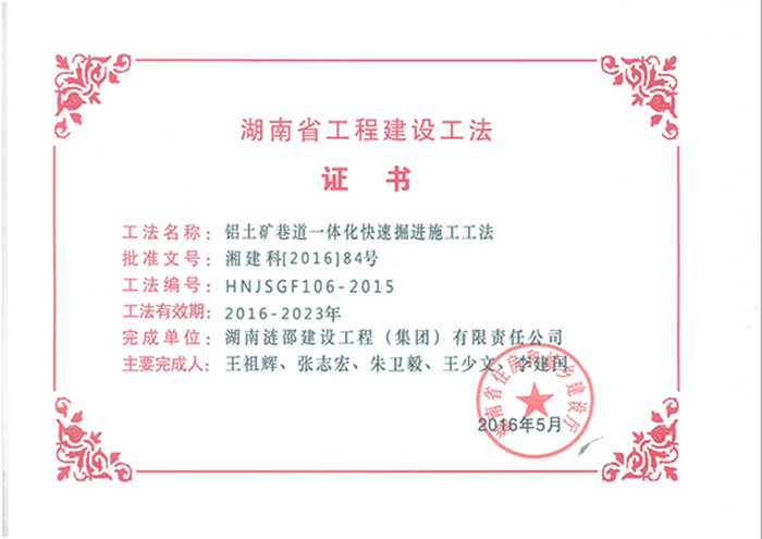 克日,,,,,湖南省住房和城乡建设厅下发了《关于宣布2015年度工程建设省级工法名单的通知》,,,,,涟邵建工申报的《铝土矿巷道一体化快速掘进施工工法》、《暗竖井小导硐反井钻机施工工法》、《矿山方形竖井快速施工工法》三部工法,,,,,审定为2015年度工程建设省级工法。。。 《铝土矿巷道一体化快速掘进施工工法》顺应铝土矿巷道一体化快速掘进施工,,,,,通过选用先进施工机械装备,,,,,接纳掘进机截割破岩、弱爆破法辅助破...