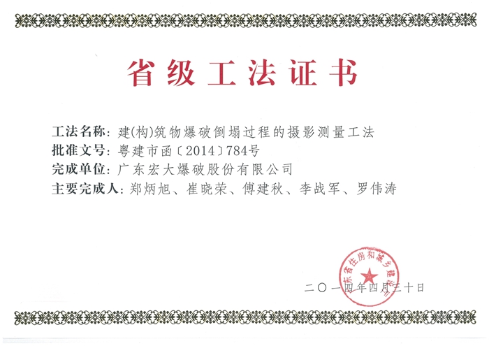 经广东省住房和城乡建设厅组织专家委员会评选、评委会审议并经网上公示,,,广东j9真人爆破股份有限公司获得两项广东省省级工法,,,工法名称划分是“建(构)筑物爆破坍毁历程的摄影丈量工法”和“危楼抢险爆破拆除...