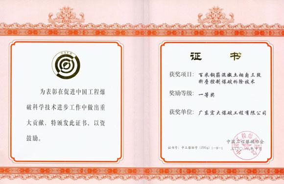 2006年10月22日至10月25日,,,,,我司在中国工程爆破协会举行的聚会上,,,,,“百米钢筋混凝土烟囱三段折叠控制爆破拆除手艺”荣获中国工程爆破协会一等奖,,,,,“84.8m高薄壁双曲线冷却塔控制爆破拆除手艺”荣获中国工程爆破协会二等奖。。。。。